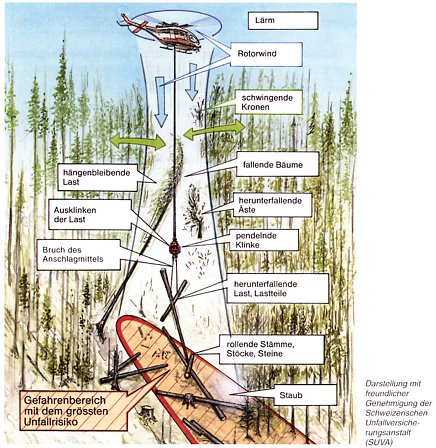 | Lastaufnahmeort: Lage des Holzes, Holzschlagverhältnisse, Arbeitsplätze, Zugangswege, Gefahrenstellen, Arbeitsbeginn und Arbeitsrichtung, Anflug, Wenden, Abflug |