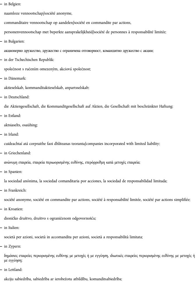 (43) Um Umgehungen der vorliegenden Richtlinie zu vermeiden, sollten Aktiengesellschaften, Kommanditgesellschaften auf Aktien oder Gesellschaften mit beschränkter Haftung im Sinne dieser Richtlinie sowie Gesellschaften, die dem Recht eines Drittlands unterliegen und eine vergleichbare Rechtsform haben, in die in Erwägungsgrund 42 genannten Regelungen einbezogen werden.