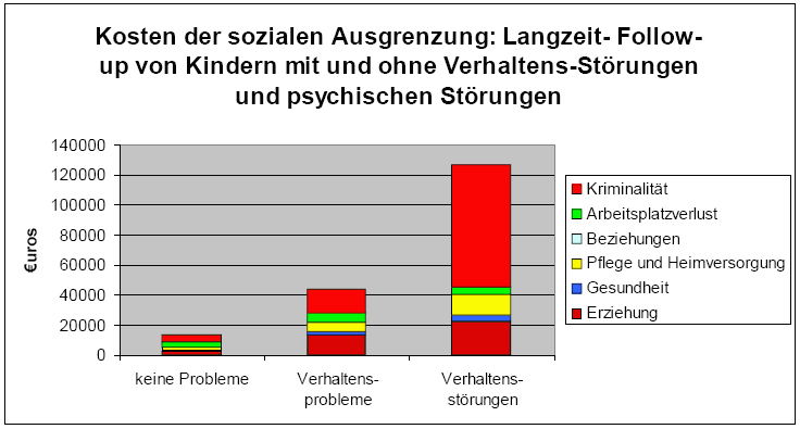 Quelle: Scott S.; Knapp M.; Henderson J.; Maughan B.: Financial cost of social exclusion. Followup study of antisocial children into adulthood, British Medical Journal (BMJ), 323, 191-196. Umrechnung in Euro durch David McDaid, Mental Health Economics European Network.