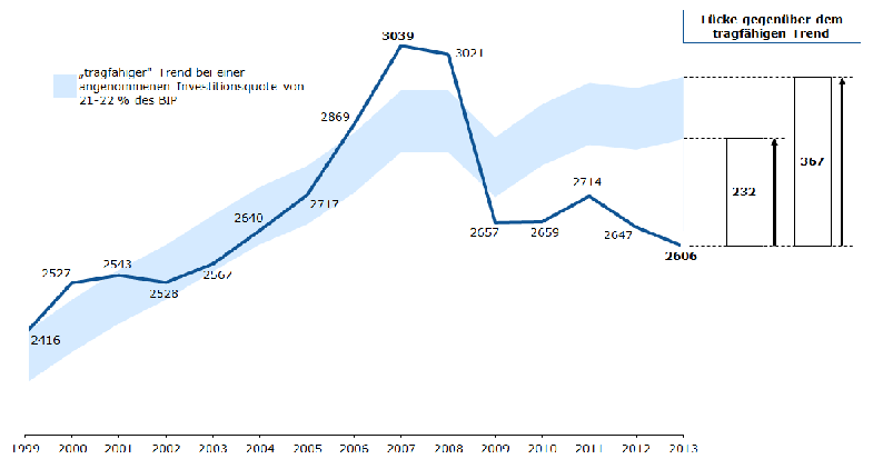 Ziel ist nicht, wieder den Höchststand von 2007 mit denselben Arten von Investitionen zu erreichen, denn einige vor der Krise getätigte Investitionen waren nicht nachhaltig. Es ist jedoch besorgniserregend, dass die Investitionen in Europa nicht wie in den USA wieder zugelegt haben. 2013 beliefen sich die Investitionen immer noch auf 19,3 % des BIP und lagen damit etwa 2 Prozentpunkte unter ihrem historischen Durchschnitt, bei dessen Berechnung die Boom- und Krisenjahre nicht einbezogen wurden. In Europa ist also eine Investitionslücke von 230 bis 370 Mrd. EUR gegenüber den langfristigen Trends entstanden.
