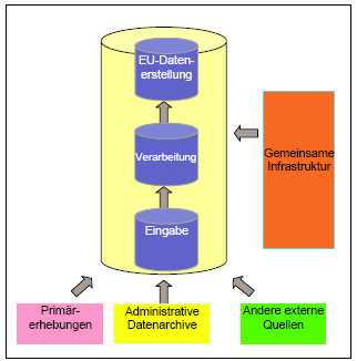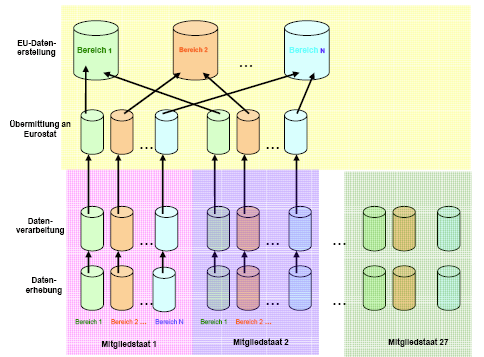 Zur Erstellung von europäischen Statistiken fasst Eurostat die Daten der einzelnen NSÄ ebenfalls bereichsweise zusammen. Dasselbe produktbezogene "Stovepipe"-Modell wird somit auch bei Eurostat angewandt, wo die harmonisierten Daten in einem bestimmten Statistikbereich zur Erstellung von einschlägigen europäischen Statistiken aggregiert werden. Der herkömmliche Ansatz für die Erstellung von europäischen Statistiken auf der Grundlage des "Stovepipe"-Modells kann somit als "erweitertes Stovepipe-Modell" bezeichnet werden, da die europäische Ebene zur nationalen Ebene hinzutritt.