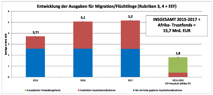 Zusammen mit den im Haushaltsentwurf 2017 vorgeschlagenen, im wesentlichen der Migrationspolitik zugedachten Mittelaufstockungen und den durch die technische Anpassung der Mittel für die Kohäsionspolitik freigewordenen Geldern sieht das in der Halbzeitüberprüfung vorgeschlagene Finanzierungspaket für die Jahre 2017-2020 einen zusätzlichen Mitteleinsatz von 13 Mrd. EUR vor, vor allem für die Bereiche Arbeitsplätze und Wachstum, Migration und Sicherheit.
