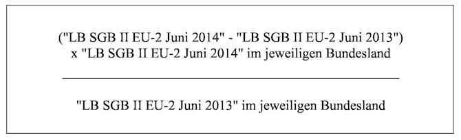 - - Um die Auswirkungen der Herstellung der vollständigen Arbeitnehmerfreizügigkeit für Staatsangehörige aus Bulgarien und Rumänien zum 1. Januar 2014 adäquat zu erfassen, wird die Berechnung anhand der aktuelleren SGB II-Daten der Monate Juni 2013 und Juni 2014 (12-Monatszeitraum) vorgenommen. - Der SGB II-Leistungsbezug von allen Personen mit Staatsangehörigkeit Bulgarien oder Rumänien in den Ländern fließt in die Berechnung ein. Es erfolgt damit keine sachfremde Einschränkung auf allein "erwerbsfähige Leistungsberechtigte".