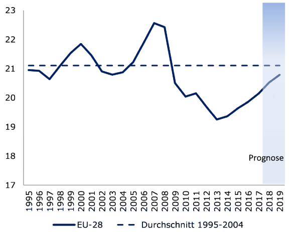 Zu den obersten Prioritäten der Juncker-Kommission gehörte es, die Wirtschaft deutlich anzukurbeln. Dies sollte durch das Schließen der infolge der Finanz- und Wirtschaftskrise entstandenen Investitionslücke in der Europäischen Union erreicht werden (Abbildung 1). Sowohl öffentliche als auch private Investitionen stellen eine entscheidende Triebkraft für Beschäftigung und Wachstum dar. Durch sie fließen Ersparnisse in Vorhaben und Sektoren, die für unsere Zukunft entscheidend sind, beispielsweise in Infrastruktur und Wohnungswesen, Forschung und Entwicklung, neue Technologien und Produktionsmethoden, Bildung und Kompetenzen. Diese Investitionen fördern auch die Modernisierung von Europas Industrien und Gesellschaften beim Übergang zu einer zunehmend digitalisierten und emissionsarmen Wirtschaft.