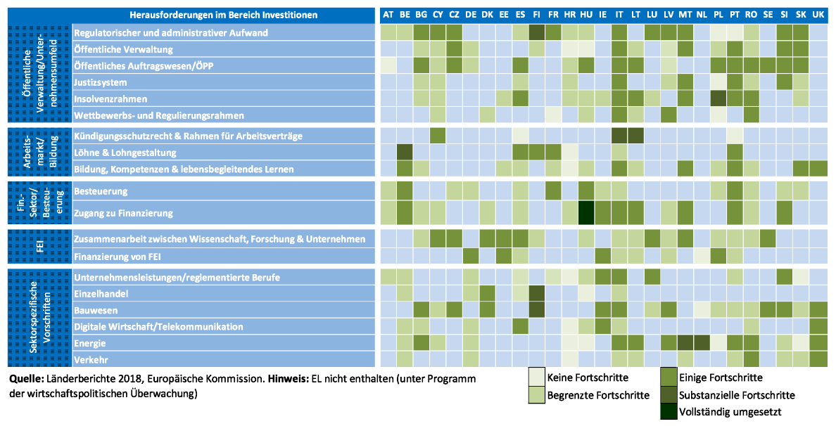 Die Kommission hat den Mitgliedstaaten einen Überblick über die wichtigsten Herausforderungen im Zusammenhang mit Investitionen auf nationaler Ebene und geeignete Reformen an die Hand gegeben.35 Die möglichen Herausforderungen im Bereich Investitionen wurden in die folgenden fünf weitgefassten Kategorien eingeteilt: