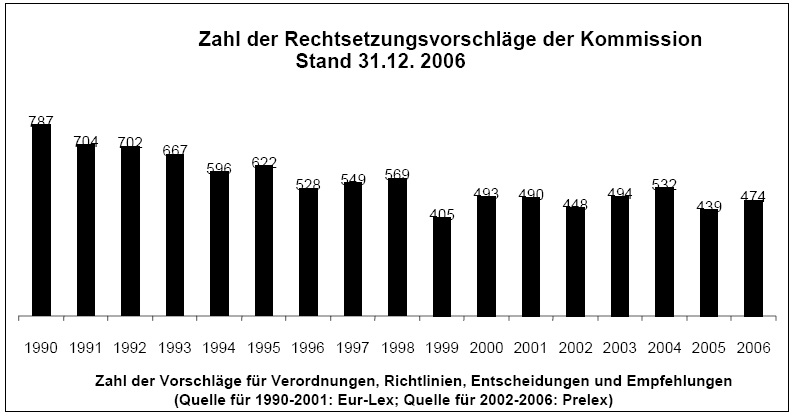 Allerdings gab es im Jahre 2006 auch Forderungen aus der Industrie, Selbstregulierungspraktiken in Koregulierungsinstrumente oder die klassische Rechtsetzung umzuwandeln19. Die Kommission berücksichtigt bei ihrem Vorgehen zwar das Potenzial von Regelungsalternativen, stellt jedoch fest, dass die Rechtsetzung in vielen Fällen die einfachste Möglichkeit zur Erreichung von EU-Zielen ist und Unternehmen und Bürgern Rechtsicherheit bietet.