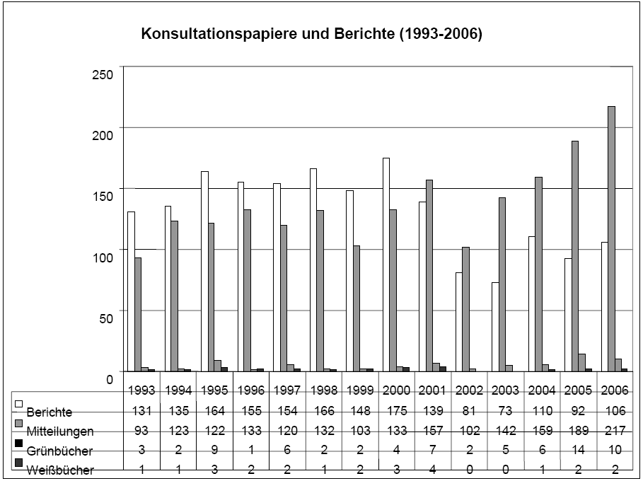 2006 stieg die Zahl der Konsultationen, die von der Kommission durchgeführt wurden, mit 217 nichtlegislativen Mitteilungen (+28 gegenüber 2004) und 129 internetgestützten Konsultationen (+23) über das Web-Portal "Ihre Stimme in Europa"7 gegenüber dem Vorjahr erheblich an.