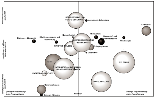 Die Abbildung liefert kein erschöpfendes Bild, illustriert jedoch die Spezifizität der einzelnen wissenschaftlichtechnologischen Bereiche. Jeder Bereich erfordert ein auf ihn zugeschnittenes Konzept für die gemeinsame Programmplanung, die sich auf Fakten und die strategische Analyse detaillierter Daten für den jeweiligen Bereich stützen sollte.
