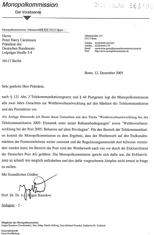 Mit den nachfolgenden beiden Schreiben haben der Präsident der Bundesnetzagentur und der Vorsitzende der Monopolkommission den Tätigkeitsbericht 2004/2005 bzw. das Sondergutachten der Monopolkommission zugeleitet.