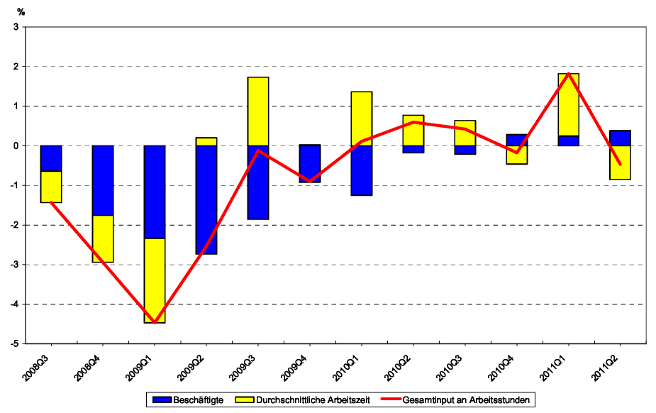Die Entwicklungen in den Mitgliedstaaten zeigen, dass mehrere Länder im ersten Quartal 2009 intensiv die Möglichkeit der Arbeitzeitverringerung genutzt haben. Vor allem in Deutschland, Belgien und Österreich kam es zu bedeutenden Arbeitszeitverkürzungen, wodurch diese Länder das gleiche Beschäftigungsniveau wie im Vorjahr halten konnten.