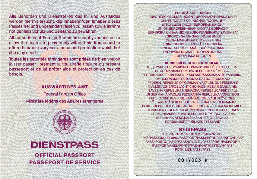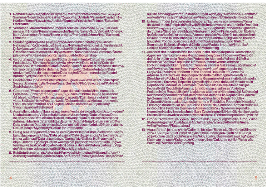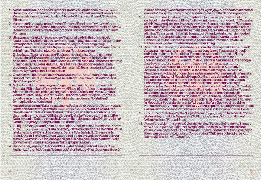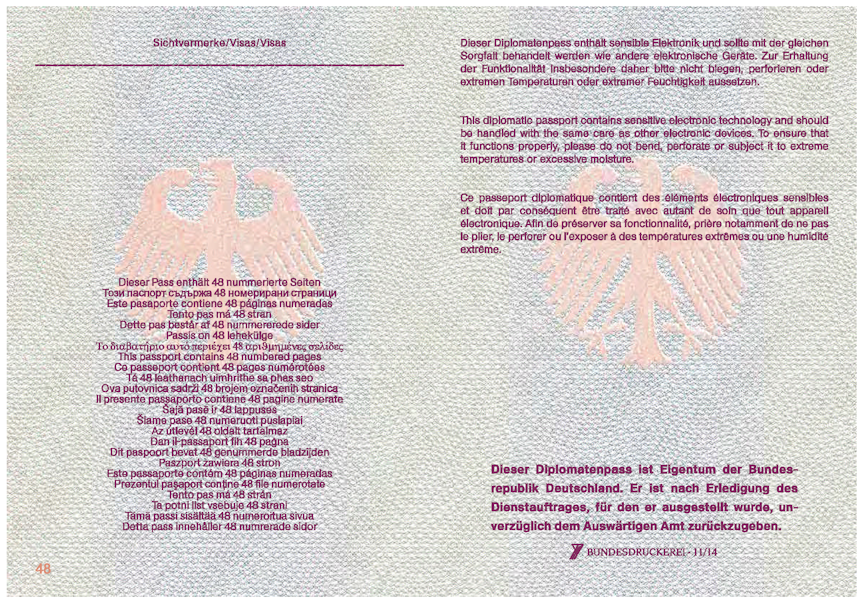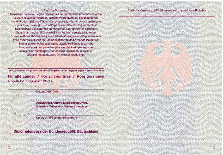 7. In dem in der Anlage 5 enthaltenen Passmuster wird Vorsatz und Passkartenrückseite, Passbuchinnenseite 2 und 3, Passbuchinnenseite 4 und 5 sowie Passbuchinnenseite 48 und Vorsatz durch das im Anhang zu dieser Verordnung enthaltene Passmuster: Diplomatenpass (48 Seiten) ersetzt.