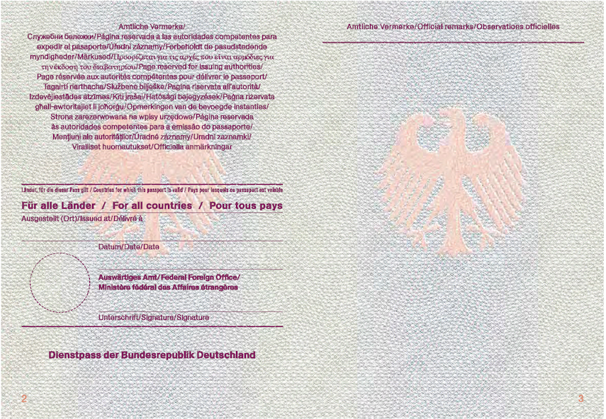 2. In dem in der Anlage 1 enthaltenen Passmuster wird Vorsatz und Passkartenrückseite, Passbuchinnenseite 2 und 3, Passbuchinnenseite 4 und 5 sowie Passbuchinnenseite 32 und Vorsatz durch das im Anhang zu dieser Verordnung enthaltene Passmuster: Reisepass (32 Seiten) ersetzt.