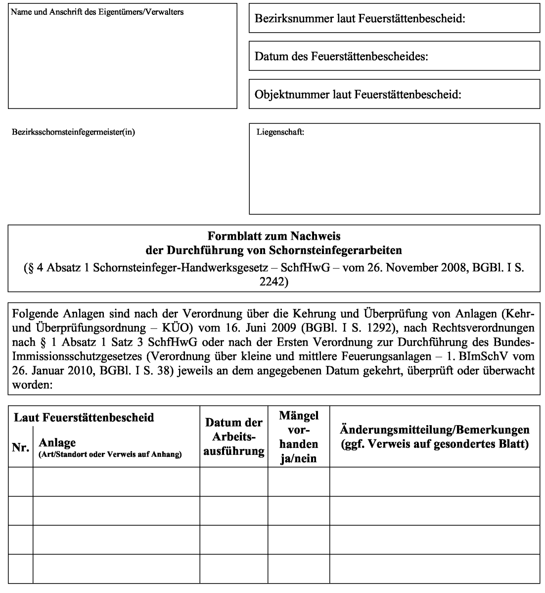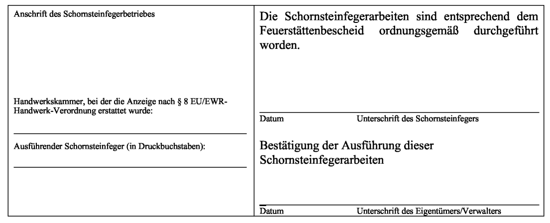 Das Formblatt sowie die Bescheinigungen sind redaktionell an die novellierte 1. BImSchV anzupassen. Weiterhin erfolgen Klarstellungen sowie eine Vereinfachung, da die Registrierungsnummer im Schornsteinfegerregister entfällt und somit im Formblatt nicht mehr angegeben werden muss.