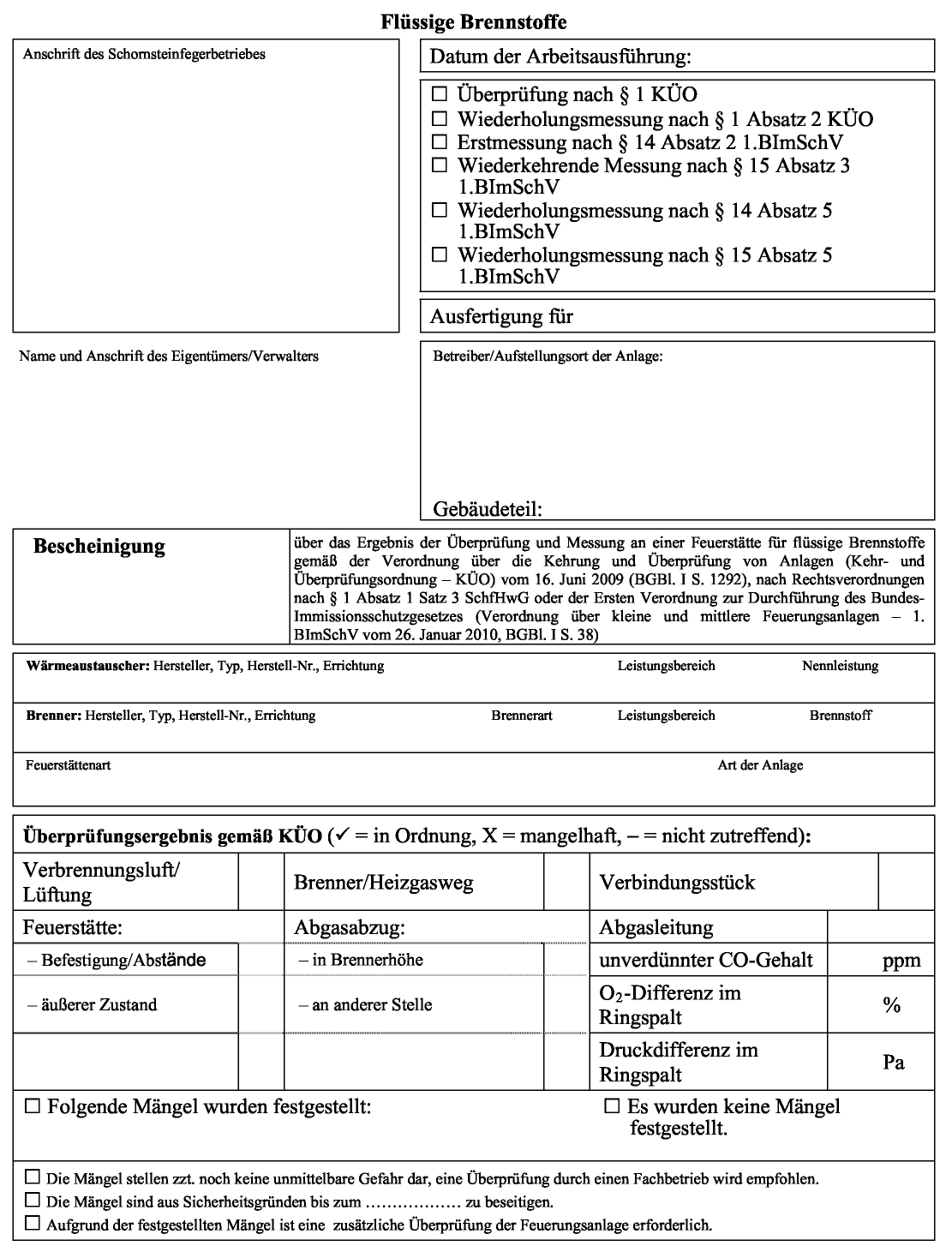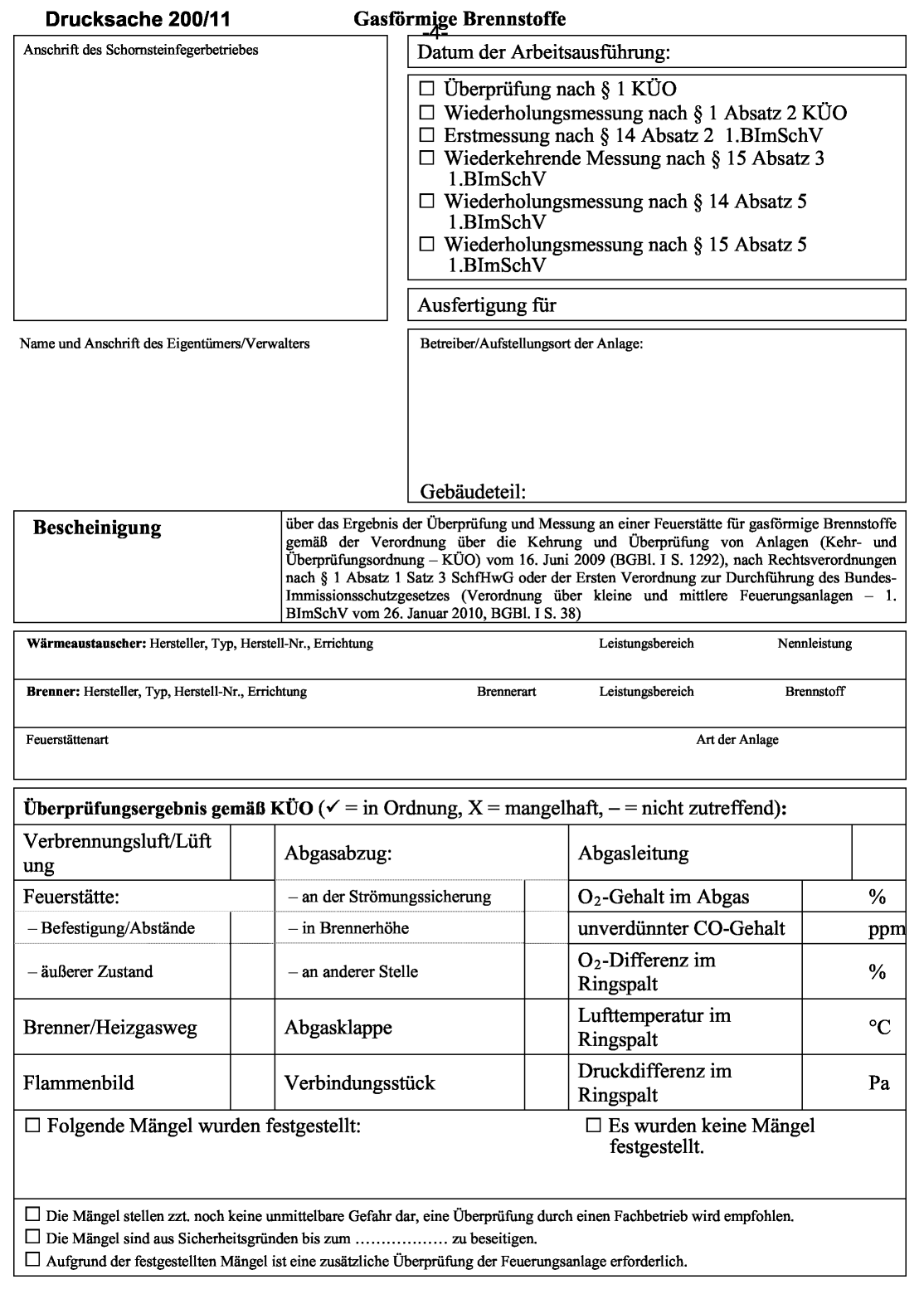 Undichtigkeiten im Abgasweg besteht bei dieser Konzentration eine konkrete Gefahr für die Menschen, die sich in der Nähe der Anlage aufhalten. Obwohl dies unabhängig von der Brennstoffart gilt, ist es sinnvoll, die CO-Begrenzung auf Anlagen für flüssige und gasförmige Brennstoffe zu beschränken, da Anlagen für feste Brennstoffe laut KÜO nicht der Überprüfungspflicht, sondern der Kehrpflicht unterliegen und auch die den vorgegebenen Grenzwert in der Regel nicht einhalten können.