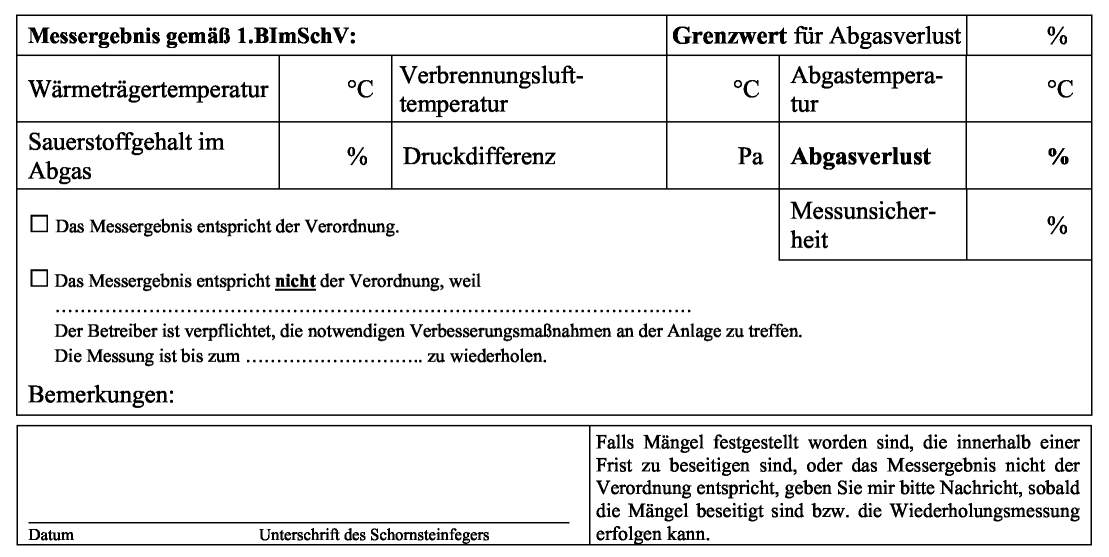 "Bei Feuerstätten, Blockheizkraftwerken, Wärmepumpen und ortsfesten Verbrennungsmotoren für flüssige und gasförmige Brennstoffe darf der Kohlenmonoxidanteil im Rahmen der Abgaswegüberprüfung bezogen auf unverdünntes, trockenes Abgas nicht mehr als 1000 ppm betragen."
