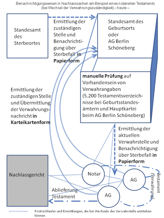- Das gegenwärtige Mitteilungswesen in Nachlasssachen nutzt die Vorteile des elektronischen Wandels und die möglichen Effizienzgewinne durch moderne Kommunikations- und Speichermedien nicht: Der jeweilige Verwahrungsort erbfolgerelevanter Urkunden ist dezentral bei ca. 5.200 Stellen auf Karteikarten registriert. Komplizierte Meldewege, veraltete Verwahrdaten und Kapazitätsgrenzen der Hauptkartei für Testamente beim Amtsgericht Schöneberg führen zu erheblichen Verzögerungen und Mehrkosten. An europäischen Bestrebungen zur Vernetzung von Registern über erbfolgerelevante Erklärungen kann sich Deutschland bislang nicht beteiligen.