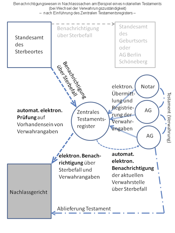 - Ab 1. Januar 2012 teilt das zuständige Standesamt der Registerbehörde den Tod, die Todeserklärung oder die gerichtliche Feststellung der Todeszeit einer Person mit (Sterbefallmitteilung). Die Registerbehörde prüft daraufhin, ob im Zentralen Testamentsregister Verwahrangaben vorliegen. Sie benachrichtigt unverzüglich das Nachlassgericht und die verwahrenden Stellen über den Sterbefall und etwaige Verwahrangaben. Die Benachrichtigung erfolgt automatisiert im Wege der Datenfernübertragung."