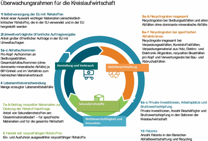 Mit dem Überwachungsrahmen sollen die Fortschritte in Richtung einer Kreislaufwirtschaft so gemessen werden, dass ihre verschiedenen Dimensionen in allen Phasen des Lebenszyklus von Ressourcen, Produkten und Dienstleistungen erfasst sind. Folglich umfasst der Überwachungsrahmen zehn Indikatoren (siehe Tabelle 1), die sich auf vier Phasen und Aspekte der Kreislaufwirtschaft verteilen: 1) Herstellung und Verbrauch, 2) Abfallbewirtschaftung, 3) Sekundärrohstoffe und 4) Wettbewerbsfähigkeit und Innovation.
