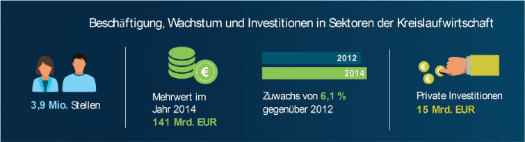 Schätzungen zufolge wurden im Jahr 2014 in bestimmten Wirtschaftssektoren der EU, die für die Kreislaufwirtschaft28 von Bedeutung sind, private Investitionen in Höhe von rund 15 Mrd. EUR (d.h. 0,1 % des BIP) getätigt. Im selben Jahr boten diese Sektoren über 3,9 Mio. Arbeitsplätze, was einem Anstieg um 2,3 % gegenüber 2012 entspricht. Trotz der Wirtschafts- und Finanzkrise schufen diese Sektoren der Kreislaufwirtschaft im Jahr 2014 rund 141 Mrd. EUR