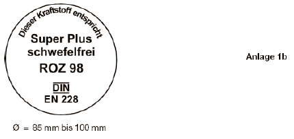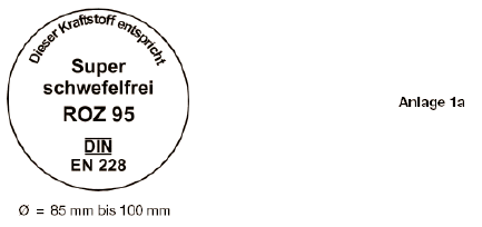 - 1. Mit "Super schwefelfrei" und dem Zeichen nach Anlage 1a, "Super Plus schwefelfrei" und dem Zeichen nach Anlage 1b sowie "Normal schwefelfrei" und dem Zeichen nach Anlage 1c wird schwefelfreier Ottokraftstoff gekennzeichnet, dessen Eigenschaften mindestens den Anforderungen der DIN EN 228, Ausgabe März 2004, entsprechen oder gleichwertig nach § 8 sind; statt mit "Normal schwefelfrei" kann die Auszeichnung mit "Benzin schwefelfrei" erfolgen.