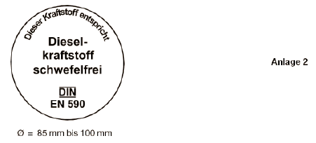 - 2. Mit "Dieselkraftstoff schwefelfrei" und dem Zeichen nach Anlage 2 wird Dieselkraftstoff gekennzeichnet, dessen Eigenschaften mindestens den Anforderungen der DIN EN 590, Ausgabe März 2004, entsprechen oder gleichwertig nach § 8 sind.