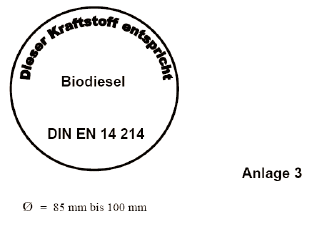 - 3. Mit "Dieselkraftstoff schwefelfrei" und dem Zeichen nach Anlage 2a wird Dieselkraftstoff gekennzeichnet, dessen Eigenschaften mindestens den Anforderungen der DIN 51628, Ausgabe August 2008, entsprechen oder gleichwertig nach § 8 sind; an den Zapfsäulen ist der Hinweis "Enthält bis zu 7 % Biodiesel" deutlich sichtbar anzubringen.