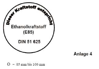 - 5. Mit "Ethanolkraftstoff (E 85)" und dem Zeichen nach Anlage 4 wird Ethanol für Kraftfahrzeuge gekennzeichnet, dessen Eigenschaften mindestens den Anforderungen der DIN 51625, Ausgabe August 2008, entsprechen oder gleichwertig nach § 8 sind.