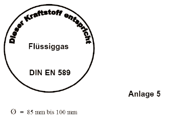 - 6. Mit "Flüssiggas" und dem Zeichen nach Anlage 5 wird Flüssiggaskraftstoff gekennzeichnet dessen Eigenschaften mindestens den Anforderungen der DIN EN 589, Ausgabe März 2004, berichtigt durch Ausgabe März 2006, entsprechen oder gleichwertig nach § 8 sind.