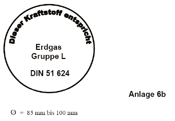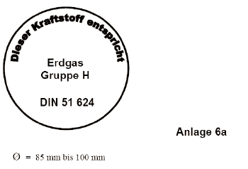 - 7. Mit "Erdgas H" und dem Zeichen nach Anlage 6a sowie mit "Erdgas L" und dem Zeichen nach Anlage 6b werden Erdgaskraftstoffe gekennzeichnet, deren Eigenschaften mindestens den Anforderungen der DIN 51624, Ausgabe Februar 2008, entsprechen oder gleichwertig nach § 8 sind.