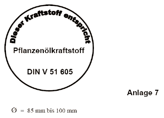 - 8. Mit "Pflanzenölkraftstoff" und dem Zeichen nach Anlage 7 wird Pflanzenölkraftstoff gekennzeichnet dessen Eigenschaften mindestens den Anforderungen der DIN V 51605, Ausgabe Juli 2006, entsprechen oder gleichwertig nach § 8 sind.