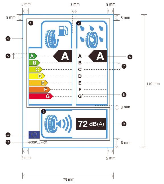 - 2.1 Die Lieferanten müssen zusammen mit dem Kennzeichen ihren Namen und die Reifenlinie, die Reifendimension, die Tragfähigkeitskennzahl, die Geschwindigkeitskategorie sowie sonstige technische Spezifikationen auf dem Aufkleber anbringen, wobei Farbe, Form und Gestaltung beliebig sind; allerdings darf die Größe des Markenfelds relativ zur Größe des Kennzeichens das Verhältnis 4:5 nicht übersteigen, und die zusammen mit dem Kennzeichen vermittelte Information darf die Aussage des Kennzeichens nicht beeinträchtigen.