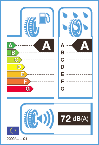 Zweikriterienkennzeichnung von Reifen der Klasse C1 nach den beiden Kriterien Kraftstoffeffizienz und Nasshaftung, mit Mindestanforderungen in Bezug auf das externe Rollgeräusch.