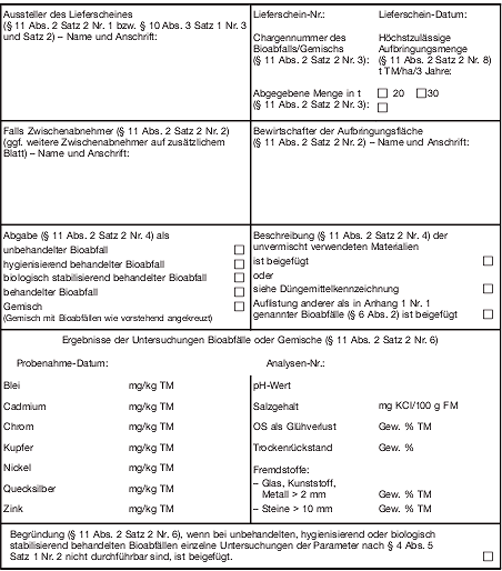 Der Lieferschein ist vom Bioabfallbehandler oder Gemischhersteller ( § 11 Absatz 2 Satz 2 Nummer 1) bzw. bei unbehandelten Bioabfällen vom Entsorgungsträger, Erzeuger oder Besitzer ( § 10 Absatz 3 Satz 1 Nummer 3 und Satz 2) auszustellen; das Original ist bis zum Bewirtschafter der Aufbringungsfläche ( § 11 Absatz 2 Satz 2 Nummer 2) weiterzugeben. Eine Kopie (Aussteller und Zwischenabnehmer) und das Original (Bewirtschafter der Aufbringungsfläche) des jeweils vollständig ausgefüllten Lieferscheines ist 10 Jahre lang aufzubewahren.