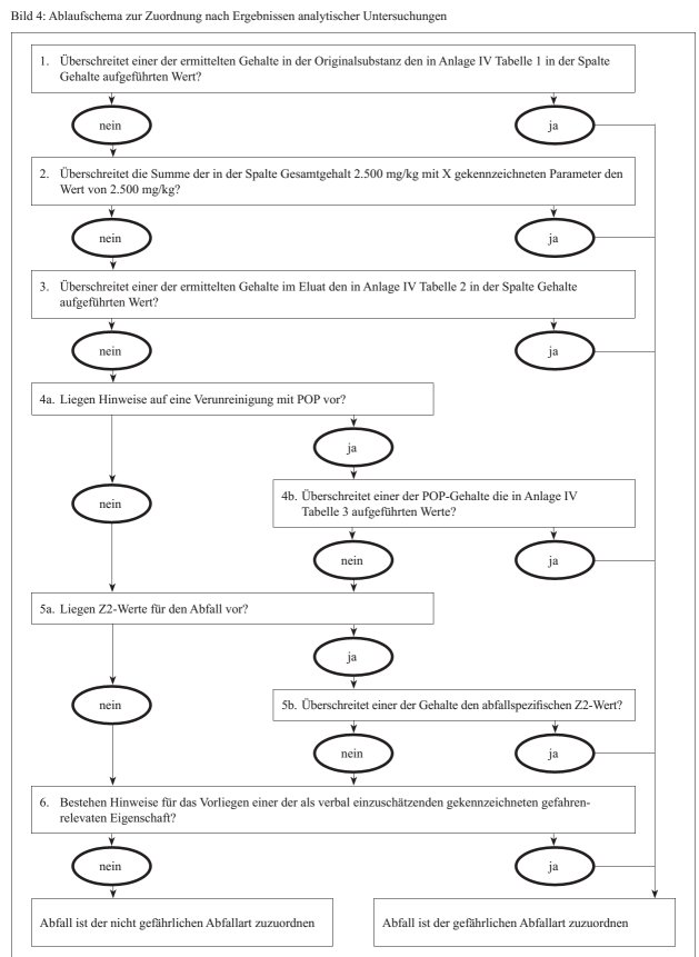 Die Zuordnung kann auch nach den Ergebnissen analytischer Untersuchungen vorgenommen werden. Die diesbezüglichen Schwellenwerte sind dazu der Anlage IV Tabelle 1, 2, 3 und 4 zu entnehmen.
