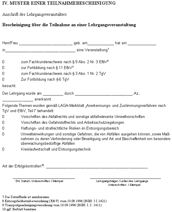 Vollzugshilfe für die Anerkennung von Lehrgängen zum Fachkundenachweis nach § 9 Abs. 2 Nr. 3 und zur Fortbildung nach § 11 der Entsorgungsfachbetriebeverordnung (EfbV) und zum Fachkundenachweis nach § 3 Abs. 1 Nr. 2 und zur Fortbildung nach § 6 der Transportgenehmigungsverordnung (TgV)