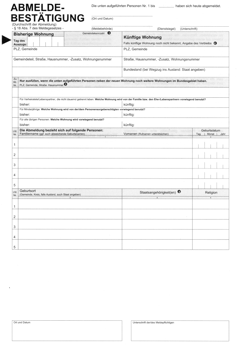 | Wer aus einer Wohnung auszieht und keine neue Wohnung im Inland bezieht, hat sich innerhalb einer Woche bei der Meldebehörde abzumelden ( § 15 Abs. 2 des Meldegesetzes) |
