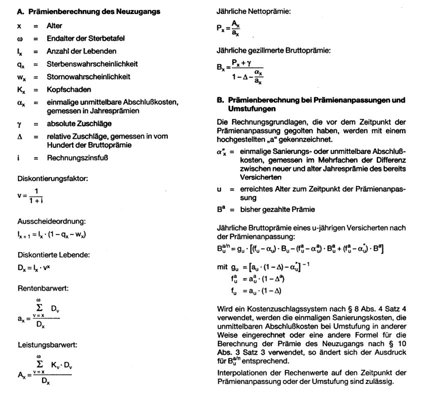(3) Planmäßig steigende Prämien dürfen für Versicherte kalkuliert werden, die das 21. Lebensjahr noch nicht vollendet haben, sowie in Ausbildungstarifen bis zum vollendeten 34. Lebensjahr der Versicherten. Für die Prämienberechnung des Neuzuganges sind die Formeln des Abschnitts a des Anhangs I oder andere geeignete Formeln, die den anerkannten Regeln der Versicherungsmathematik entsprechen, zu verwenden.