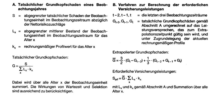 (3) Die Berechnung der erforderlichen Versicherungsleistungen erfolgt nach der Formel des Abschnitts B des Anhangs II. Bei der Gegenüberstellung nach § 12b Abs. 2 Satz 2 des Versicherungsaufsichtsgesetzes ist der tatsächliche, auf den 18 Monaten nach Ende des letzten Beobachtungszeitraumes liegenden Zeitpunkt extrapolierte Grundkopfschaden mit dem Grundkopfschaden, der für das Ende dieses Zeitraumes rechnungsmäßig festgelegt ist, zu vergleichen. Die Verwendung gleichwertiger Verfahren zur Berechnung der erforderlichen Versicherungsleistungen ist zulässig, wenn das Versicherungsunternehmen zum Zeitpunkt der Einführung eines Tarifes dieses Verfahren der Aufsichtsbehörde unter Angabe der Formeln und Beifügung der versicherungsmathematischen Herleitung darlegt. Bei bestehenden Tarifen kann auf ein anderes Verfahren nur aus wichtigem Grund in unmittelbarem Anschluß an eine Prämienanpassung übergegangen werden; Satz 3 gilt entsprechend.