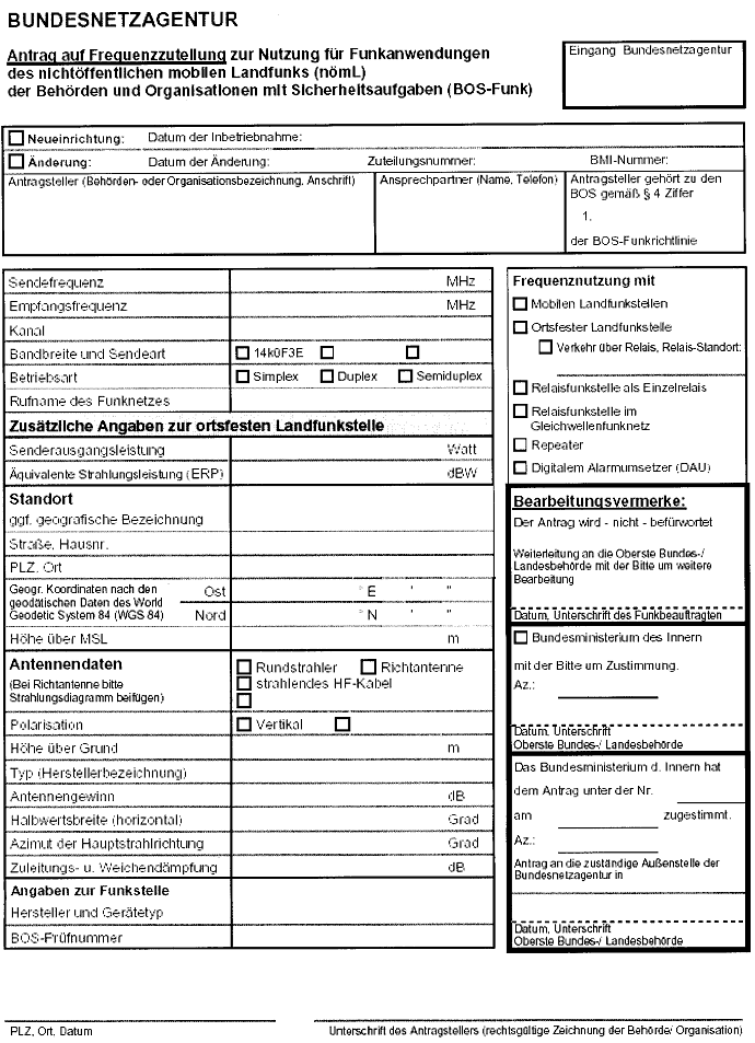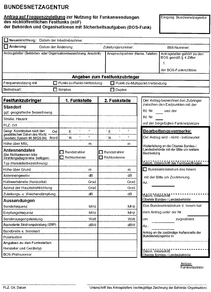 | zum Antrag auf Frequenzzuteilung zur Nutzung für Funkanwendungen des nichtöffentlichen Festfunks (nöF) der Behörden und Organisationen mit Sicherheitsaufgaben (BOS-Funk) |