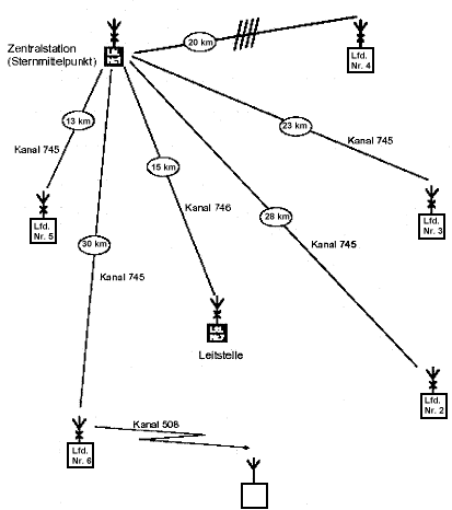 Schematische Darstellung der Festfunkzubringer mit Antennen. Funkstellen, Kanälen und Entfernungen