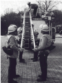 Die Sicherung der Leiter gegen Umstürzen übernimmt der Trupp im allgemeinen selbst. Der dritte Feuerwehrangehörige kann dann für andere Aufgaben eingesetzt werden.