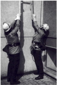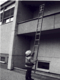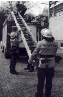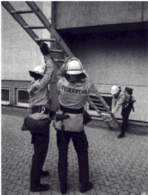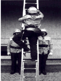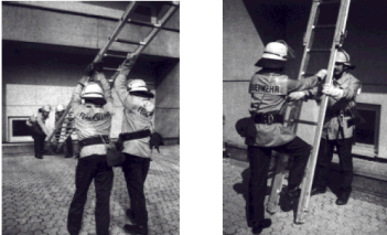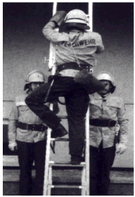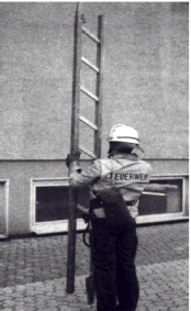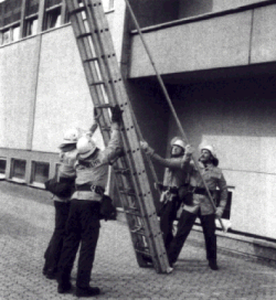 Die Sicherung der Leiter gegen Umstürzen übernimmt der Trupp im allgemeinen selbst. Der zweite Trupp kann dann für andere Aufgaben eingesetzt werden.