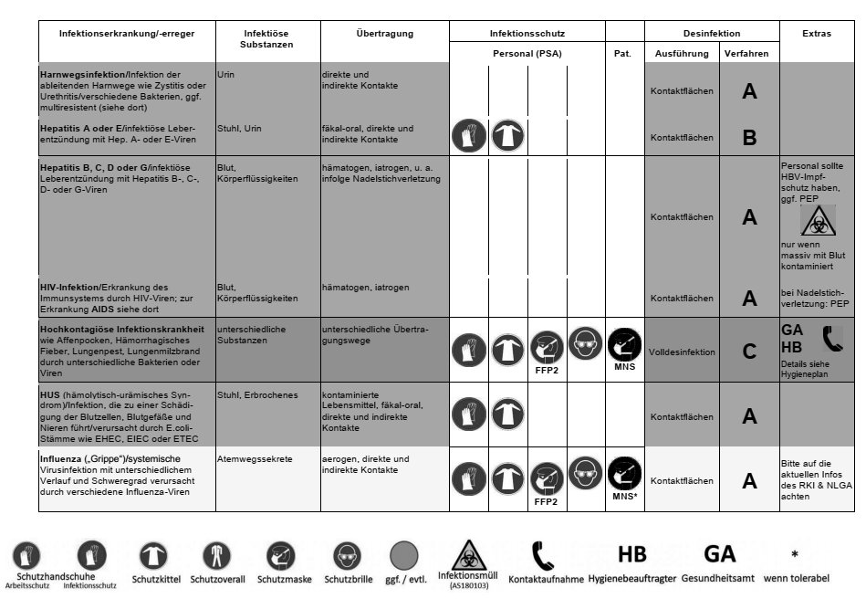 In der Maßnahmentabelle im Kapitel 3 sind die bei den verschiedenen Infektionskrankheiten und -erregern einzusetzenden Desinfektionsmaßnahmen benannt.