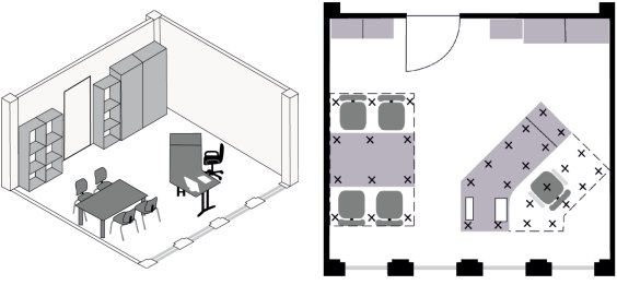 Bei den genannten Anwendungsfällen für die raumbezogene Beleuchtung ist es möglich in der Grundausstattung den gesamten Raum mit dem Mindestwert der Beleuchtungsstärke für den Umgebungsbereich entsprechend der späteren Nutzung zu beleuchten. In diesen Fällen ist durch zusätzliche Beleuchtung, z.B. mobile Beleuchtungssysteme, die Mindestbeleuchtungsstärke für den Bereich des Arbeitsplatzes sicherzustellen.