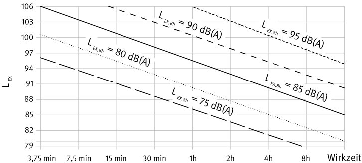 Gleichzeitige Belastungen durch Lärm, arbeitsbedingte ototoxische Substanzen oder Vibrationen können sich auf lärmbedingte Hörstörungen negativ auswirken. Tages-Lärmexpositionspegel von 80, 85 bzw. 90 dB(A) werden bereits bei folgenden Schalldruckpegeln und Wirkzeiten erreicht: