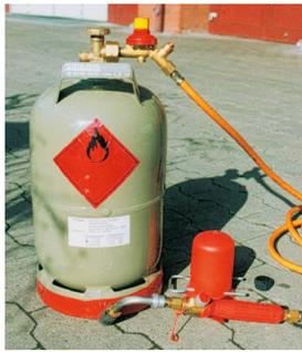 Zum Löten, Erwärmen von Vergussmasse, Montieren von Schrumpfmuffen usw. werden fast ausschließlich Flüssiggase - in der Regel Propan, Butan - verwendet. Flüssiggas benötigt zum Verdampfen Wärme. Sie wird der Umgebungsluft "entnommen". Der hierfür maßgebliche Siedepunkt des Flüssiggases gibt an, bei welcher Temperatur der Übergang von der flüssigen in die Gasphase beginnt. (Der Siedepunkt beträgt bei Butan -1 °C und bei Propan -42 °C.) Wenn Flüssiggasflaschen kälter als der Siedepunkt des Flüssiggases sind, geben sie somit kein Gas mehr ab. Solche Flaschen werden dann häufig als leer angesehen, obwohl sie noch Flüssiggas enthalten. Werden diese Flaschen jedoch in Räume gebracht, deren Temperatur über dem Siedepunkt des Flüssiggases liegt, kann wieder eine Verdampfung erfolgen. Deshalb auch angeblich leere Flaschen stets ordnungsgemäß schließen.