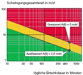 Bei Schwingungsbelastungen oberhalb der Auslösewerte sind zur Vermeidung gesundheitlicher Schäden Präventionsmaßnahmen angezeigt (gelber Bereich, Bilder 4-33 bis 4-35).