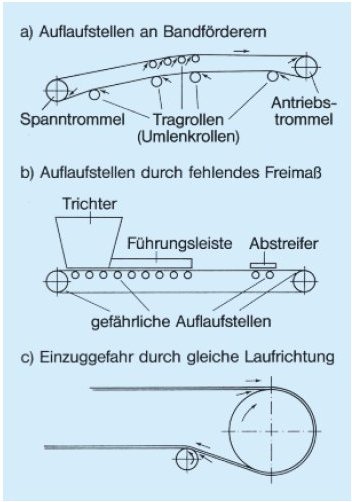 Auflaufstellen von Bandförderern müssen deshalb so gesichert sein, dass nicht hineingegriffen werden kann. Die Schutzeinrichtungen dürfen während des Betriebes nicht entfernt werden.