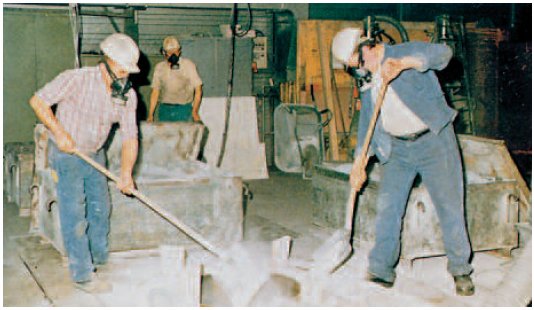 Hierbei können hohe Staubkonzentrationen in der Umgebungsluft auftreten. Quarz-Feinstaub lagert sich, wenn er eingeatmet wird, in der Lunge ab und kann Quarzstaublungenerkrankungen verursachen, die Silikose. Deshalb muss bei allen Arbeiten, bei denen Quarz-Feinstaub entstehen oder in der Umgebungsluft vorhanden sein kann, dafür gesorgt werden, dass die Gießereiarbeiter keine gefährlichen Staubmengen einatmen können, denn Silikoseerkrankungen sind nicht heilbar.