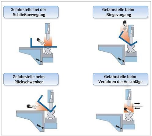 Bei Pressenarbeiten sind während der Schließbewegung des Werkzeuges vor allem die Finger und die Hände, bei Großpressen auch der Oberkörper oder der gesamte Körper gefährdet.
